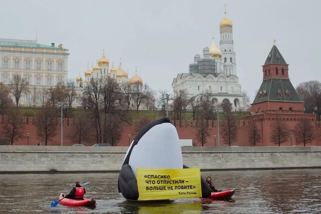 Сегодня рядом с Кремлевской набережной спустили на воду надувную косатку с плакатом «Спасибо, что отпустили — больше не ловите!». Так активисты решили привлечь внимание к необходимости запрета на вылов китообразных в учебных и культурно-просветительских целях.