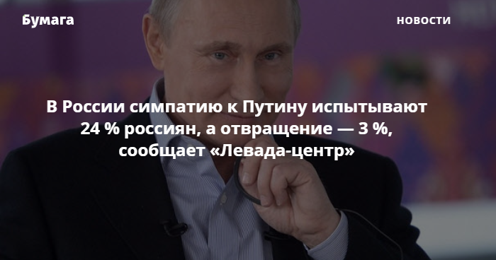 «Левада-центр» провел опрос россиян об отношении к президенту России Владимиру Путину. Социологи выяснили, что симпатию к Путину испытывают 24 % респонедентов, а отвращение — 3 %. Об этом пишут «Ведомости» со ссылкой на опрос.
