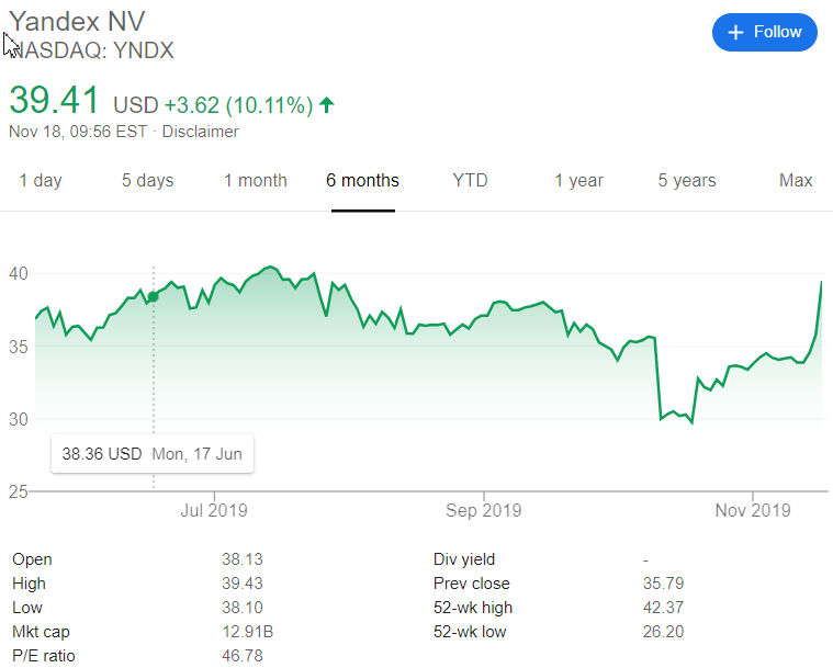 Котировки «Яндекса» на Nasdaq подскочили на 10%