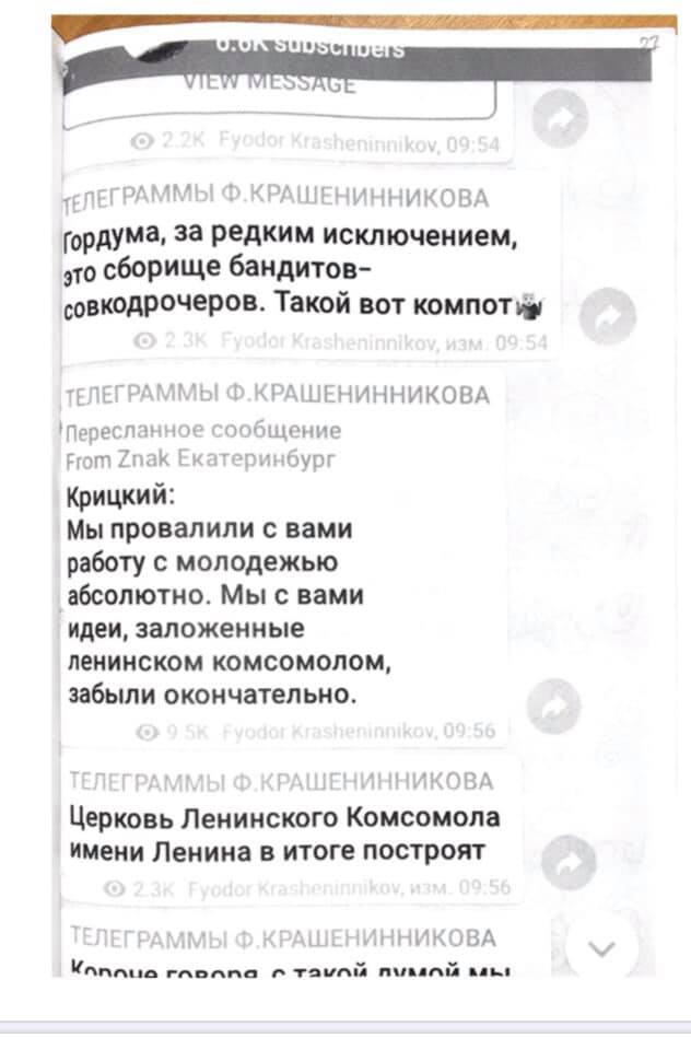 Составлявшая протокол на политолога инспектор УВД Екатеринбурга М.К. Назарова писала в своем рапорте, что телеграм-канал ведет Крашенинников, поскольку после обыска у него дома по «делу ФБК» там появились посты об этом «с использованием личных местоимений».