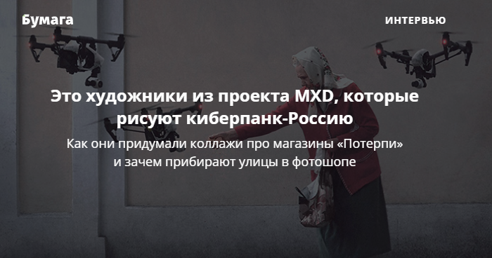 Два года назад четыре диджитал-художника — Виктор Могилат, Евгений Зубков, Лев Переулков и Андрей Кочергин — создали арт-проект MXD, в котором рисуют сюрреалистичные картины о жизни в России. Они сделали коллажи про магазины «Потерпи», «Дорого» и «Тлен», переосмыслив названия популярных продуктовых сетей, а также серию работ про 1990-е годы в стиле киберпанк.