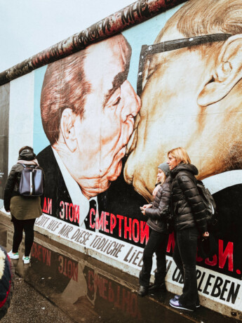 Знаменитый стрит-арт с целующимся Брежневым найдёте на Галерее Ист-Сайд. Но до этого изображения ещё нужно дойти, потому что вся стена занимает 1,3 километра. Брежнева определите по большой очереди из туристов.