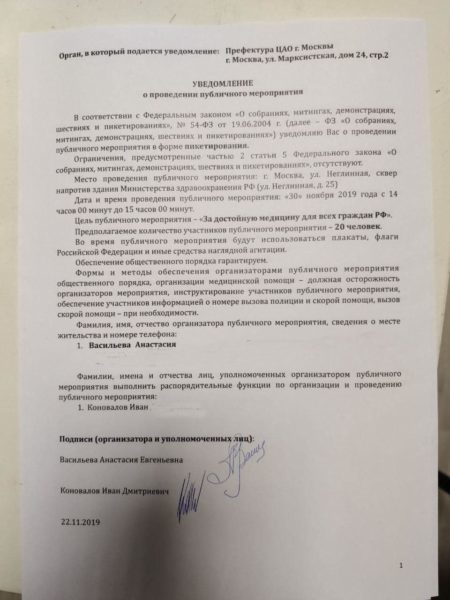 Пикеты, в которых примут участие 20 человек, пройдут в сквере у здания Минздрава на Неглинной улице в Москве. Аналогичные акции пройдут в девяти городах России, в том числе в Санкт-Петербурге, Ярославле и Кургане.