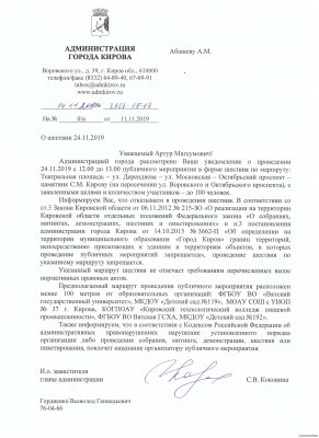 В Кирове судья Первомайского районного суда Дмитрий Бармин 21 ноября признал незаконным отказ администрации города согласовать шествие по центральным улицам города. Об этом сообщает журнал 7×7.