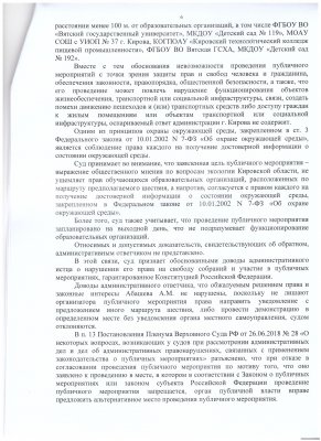 Представители администрации Кирова в суде заявил, что чиновники своим запретом провести акцию не нарушили права Абашева. По их мнению, ничто не мешало мужчине подать другое уведомление на шествие с иным маршрутом.