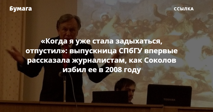 Выпускница СПбГУ, которая в 2008 году пожаловалась на избиение историком Олегом Соколовым (сейчас арестованным за убийство аспирантки СПбГУ), анонимно рассказала в интервью «Фонтанке», как познакомилась с доцентом, как он ее избил и почему заявление на мужчину не приняли в петербурсгкой полиции.