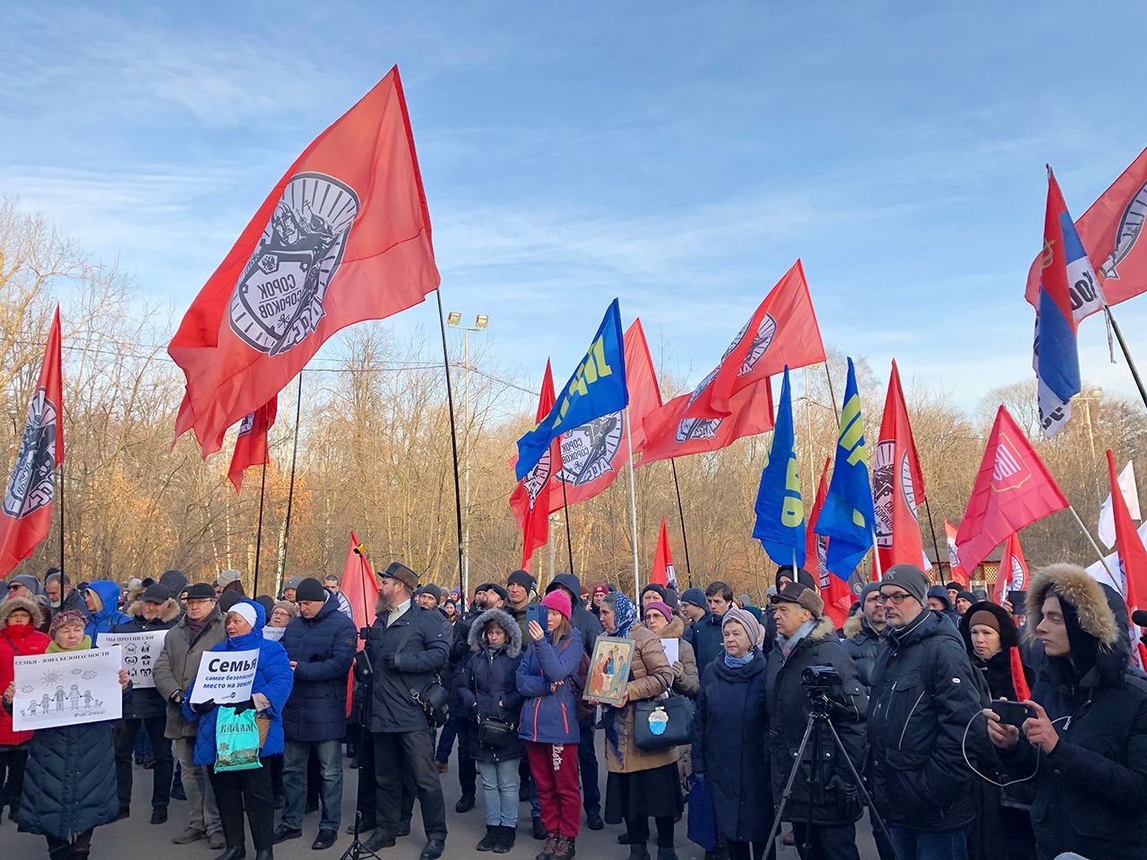 Вокруг сцены на небольшом асфальтированном пятачке гайд-парка в «Сокольниках» толпятся около 200 человек. У многих в руках красные флаги с аббревиатурами — ДСС (это те самые «Сорок сороков»), ПВО (организация «Патриоты Великого Отечества») и МП (движение «Мужской путь»). Есть и знамена других цветов и их символику проще расшифровать: белые — «Ассоциации родительских комитетов и сообществ», а синие — ЛДПР.