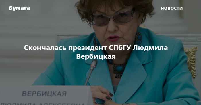 В Петербурге 24 ноября на 84-м году жизни умерла президент СПбГУ Людмила Вербицкая. Об этом «Бумаге» сообщили в пресс-службе вуза.
