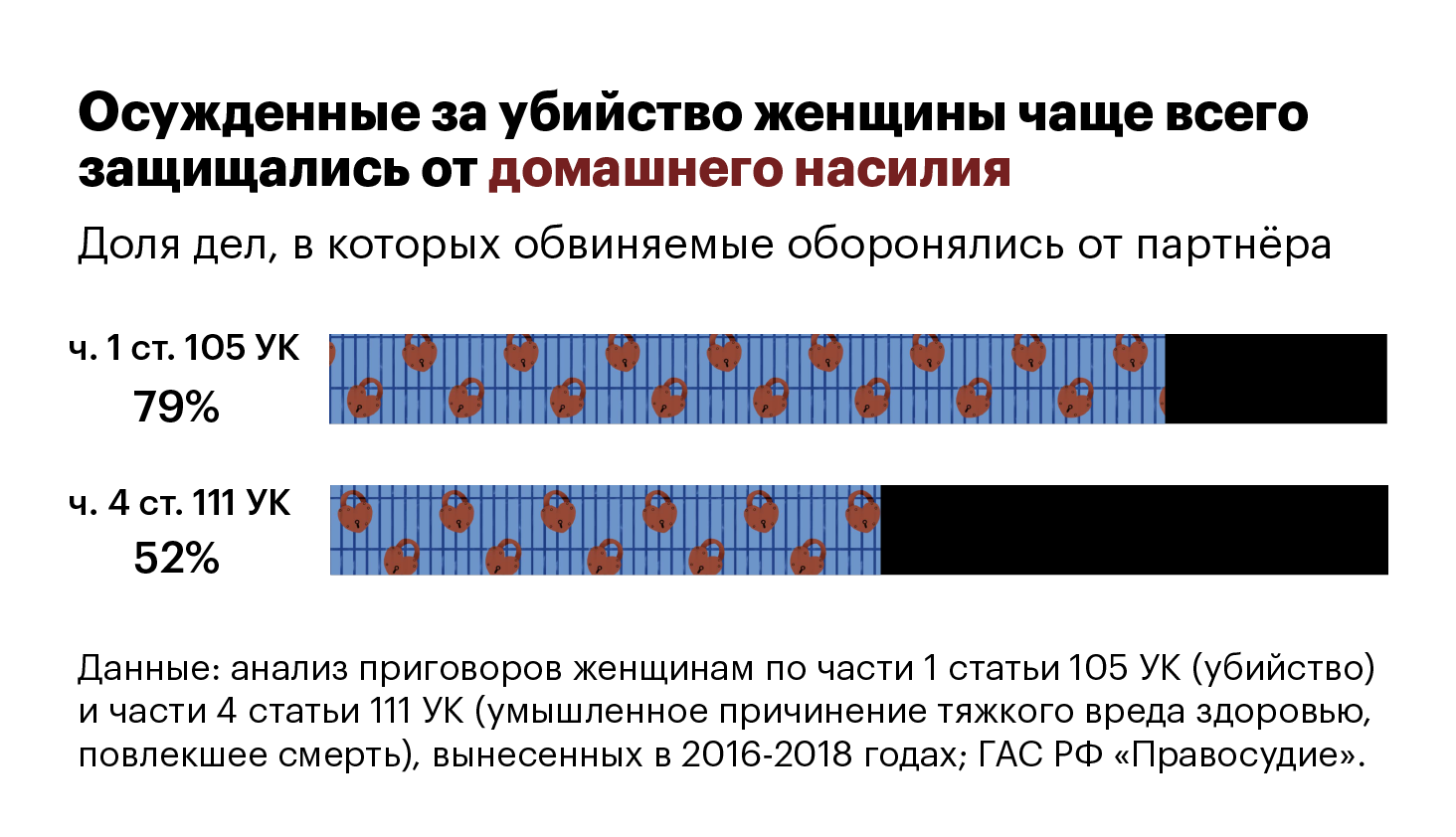 Команда «Медиазоны» обнаружила, что большая часть осужденных за умышленное убийство россиянок на самом деле защищались от своих партнеров. Сроки женщинам выносили по тяжким уголовным статьям (часть 1 статьи 105 и часть 4 статьи 111 УК): в обоих случаях обвиняемым грозит до 15 лет заключения.