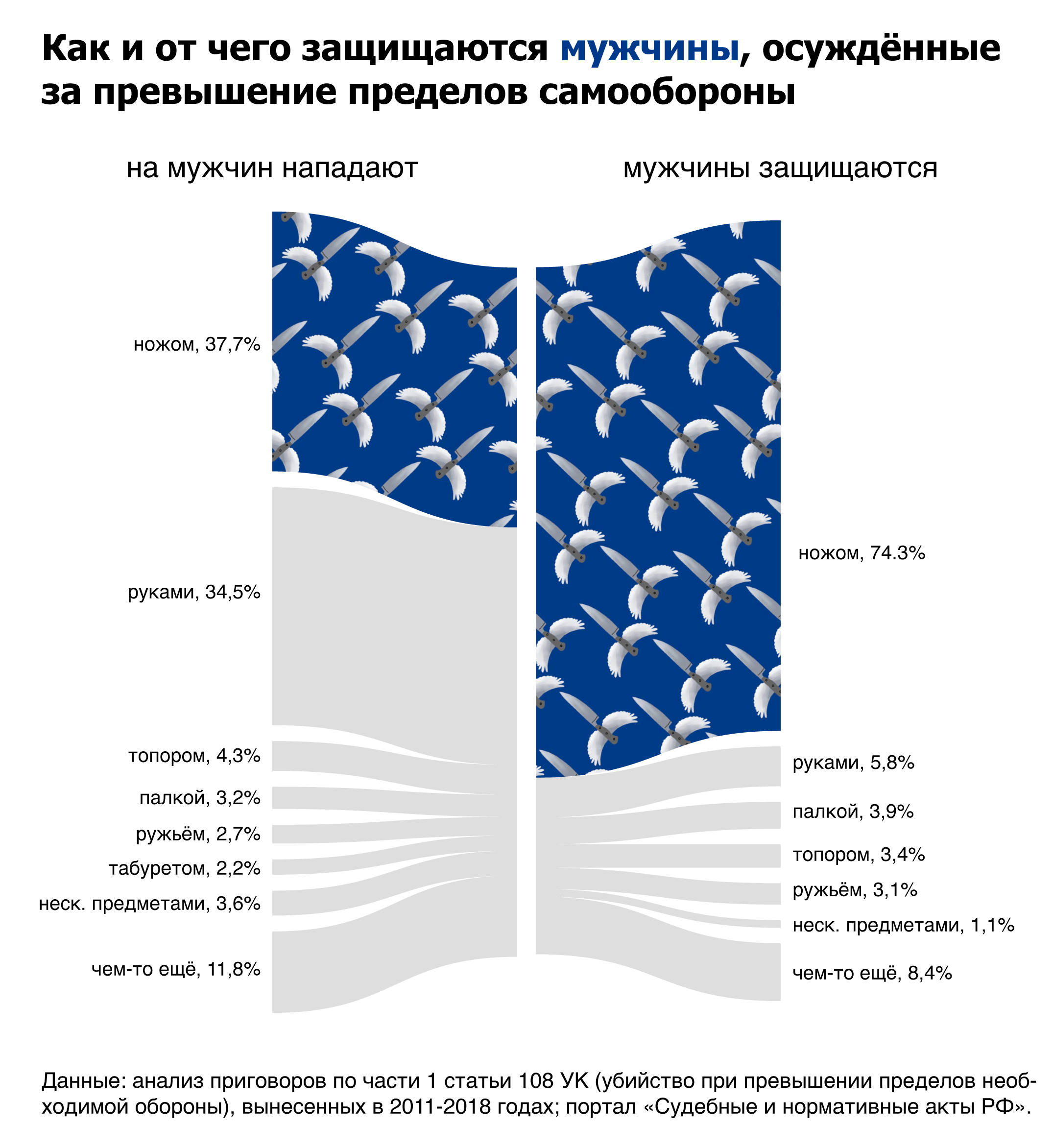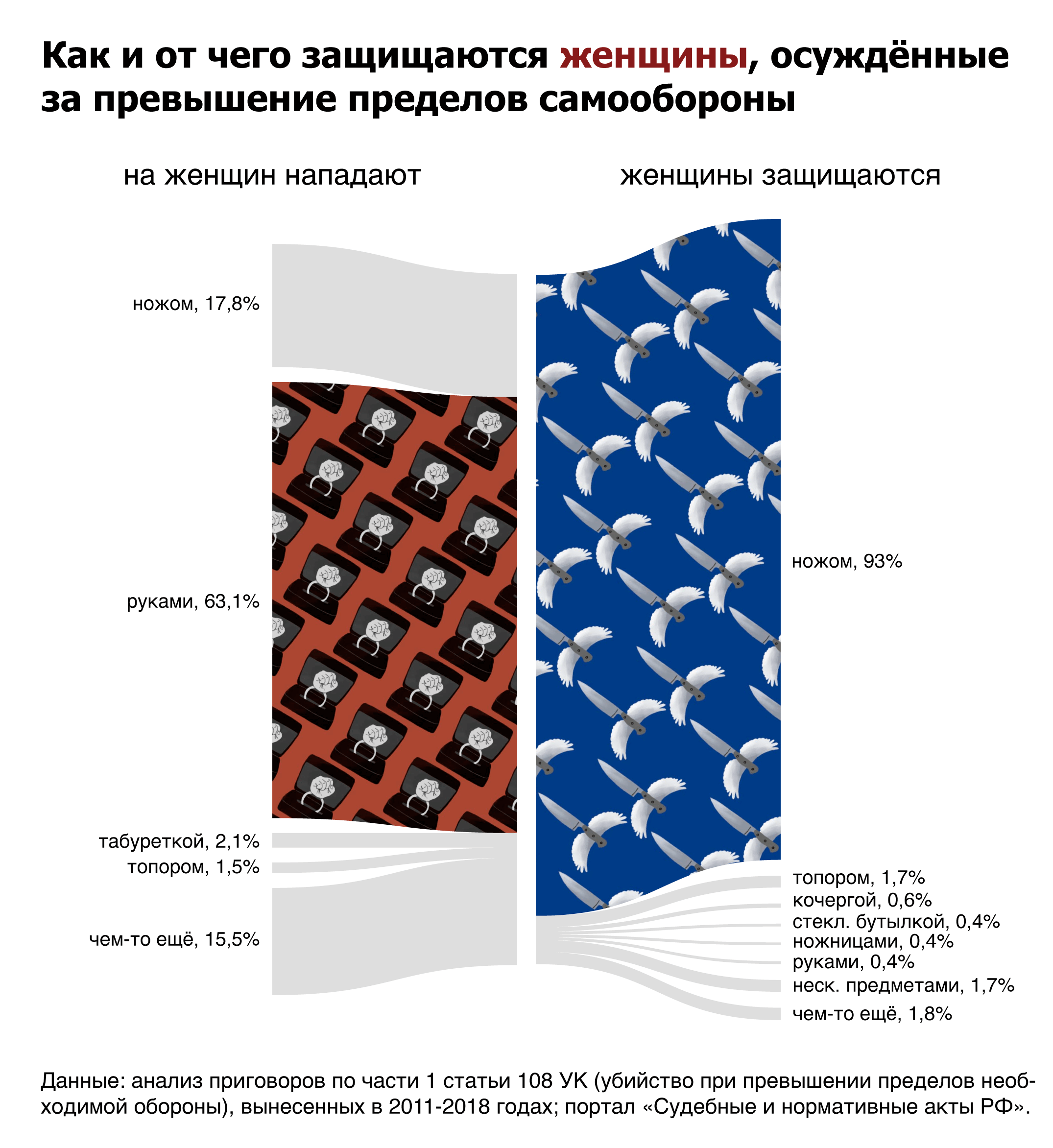 Как правило, женщины защищались тем, что попадалось под руку. В 93% приговоров это был кухонный нож. При этом мы нашли всего два случая, когда сами женщины смогли убить нападавших голыми руками (задушили), это меньше половины процента от выборки.