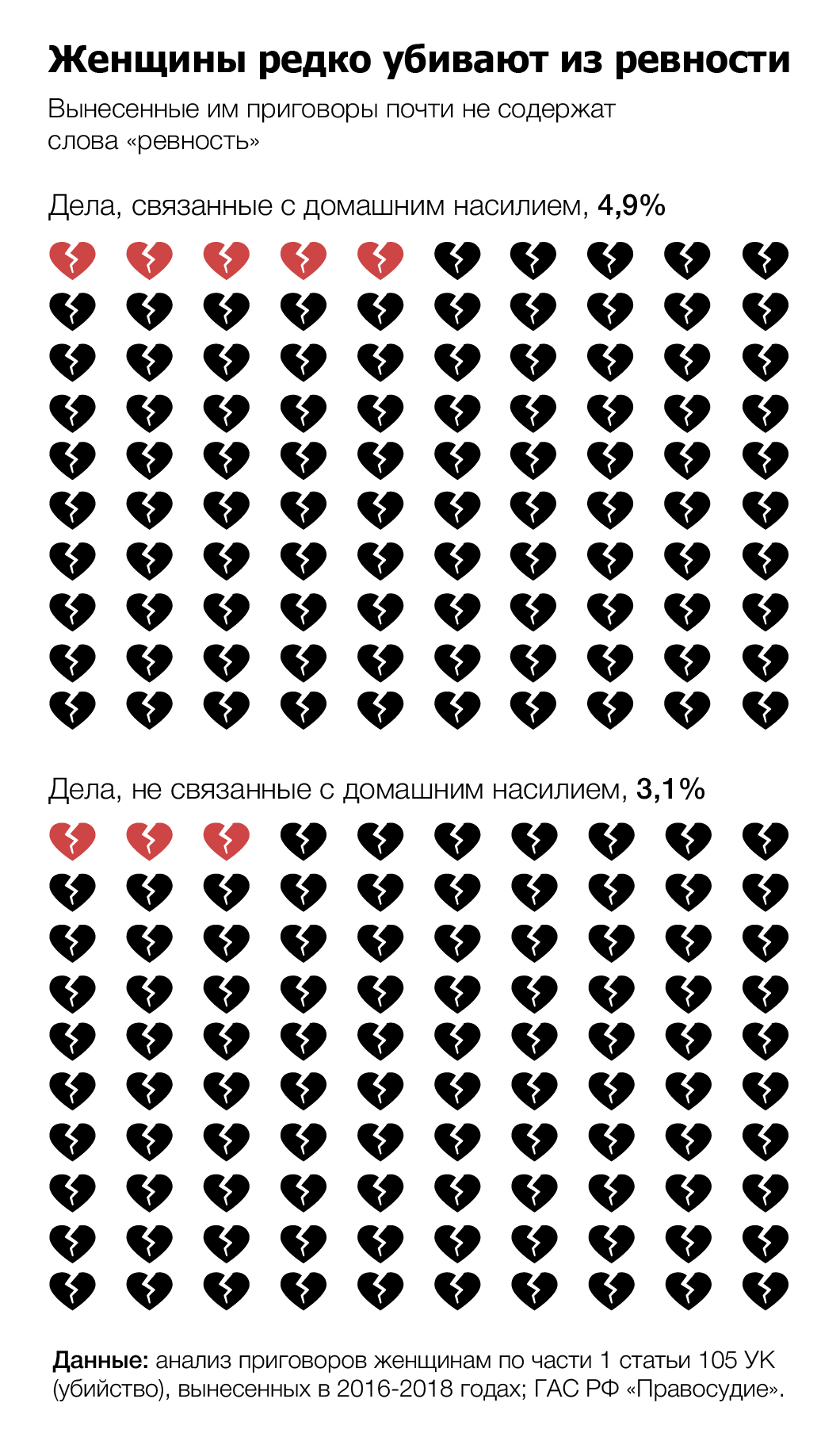 В изученных нами текстах 2 552 приговоров об убийствах речь о ревности заходит очень редко — меньше чем в 5% уголовных дел. В подавляющем большинстве случаев женщина совершает убийство непреднамеренно и в целях самозащиты.