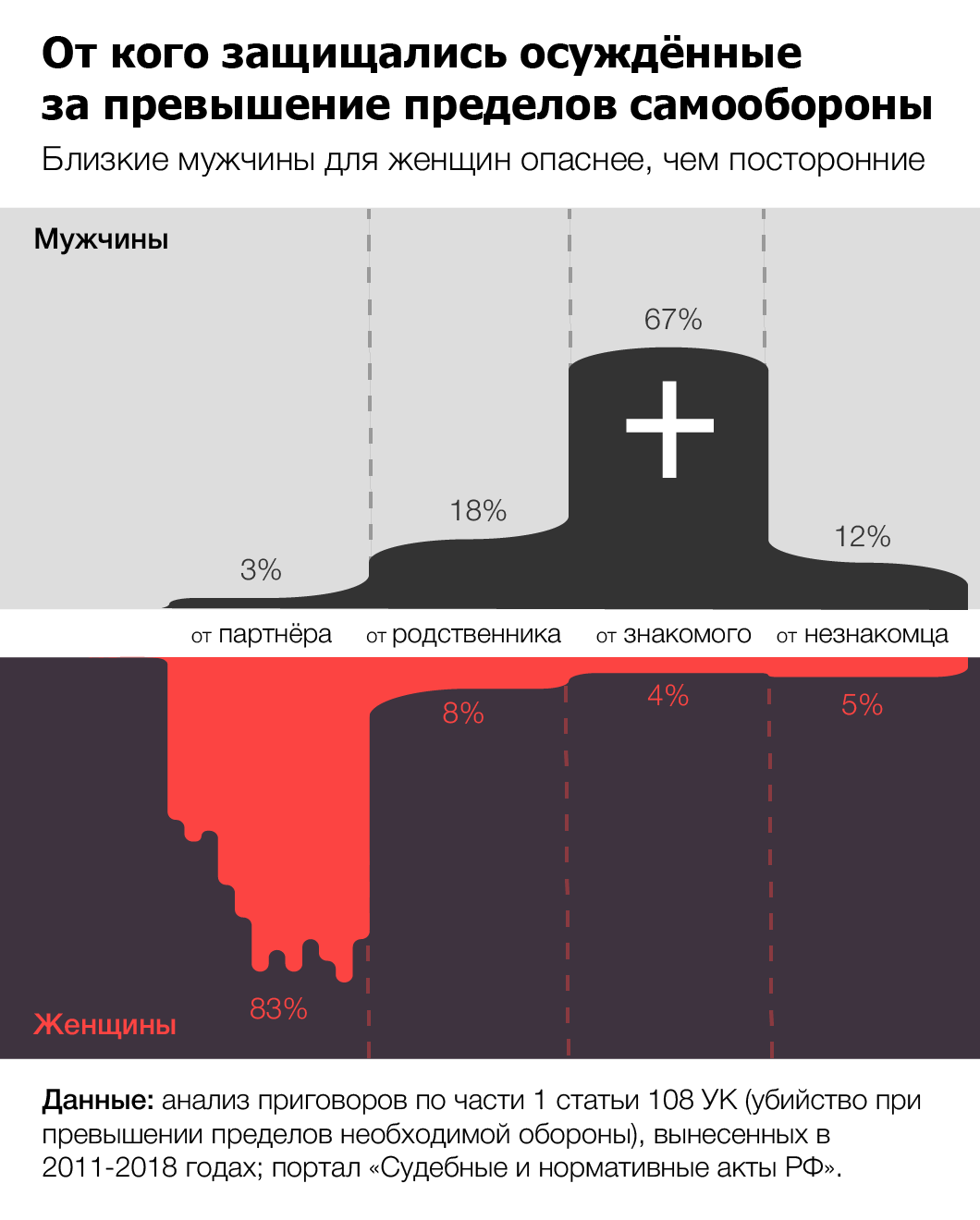 Наказание для тех, чьи действия квалифицируют как убийство при превышении пределов необходимой обороны (часть 1 статьи 108 УК), значительно мягче — до двух лет заключения. Но и в этом случае женщинам зачастую приходится сидеть в тюрьме лишь потому, что они не могут защититься от агрессоров голыми руками. При этом команда «Новой газеты» обнаружила, что 91% женщин, осужденных за превышение самообороны, защищались от своих партнеров или других родственников-мужчин. Мужчины, осужденные по такой же статье, защищались от партнерш всего в 3% случаев.