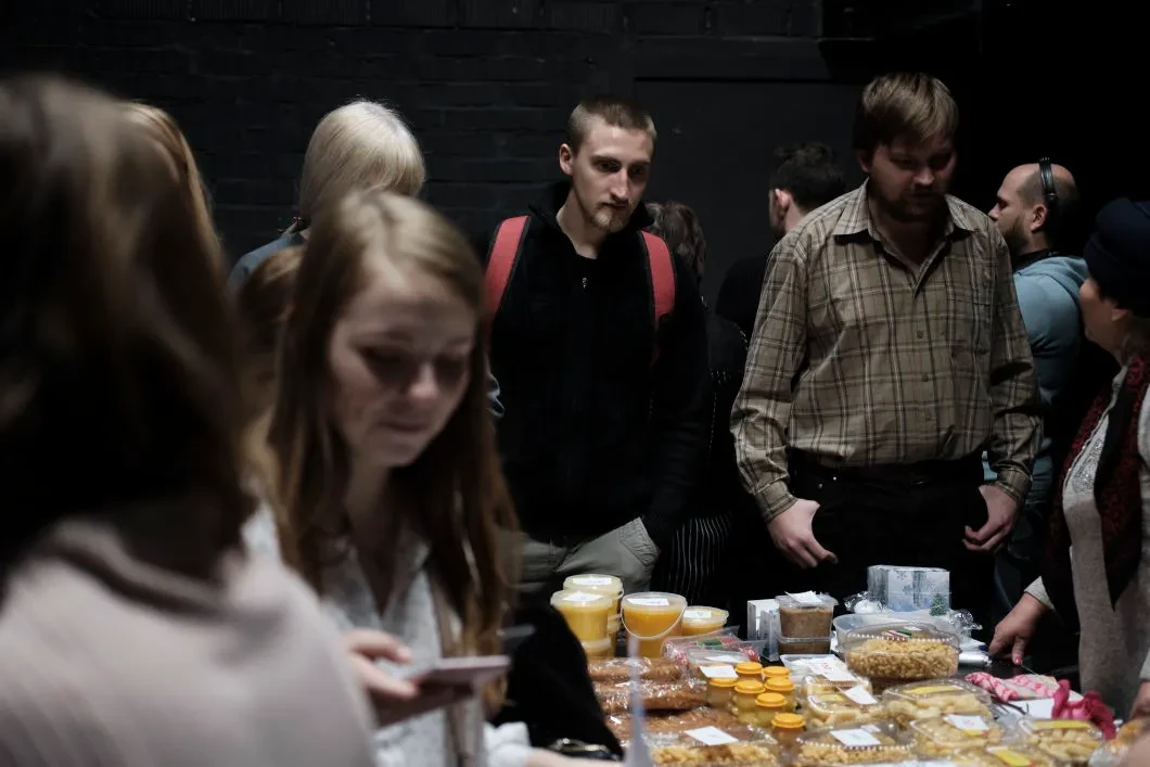 Ярмарку назвали «Пирожки от мамы политзаключенного». Сочники, плюшки, чак-чак, пирожки — красочный стол буквально ломился от выпечки. Свою площадку мамам в этот день предоставил Театр.doc, которому тема неправосудных уголовных дел никогда не была безразлична.