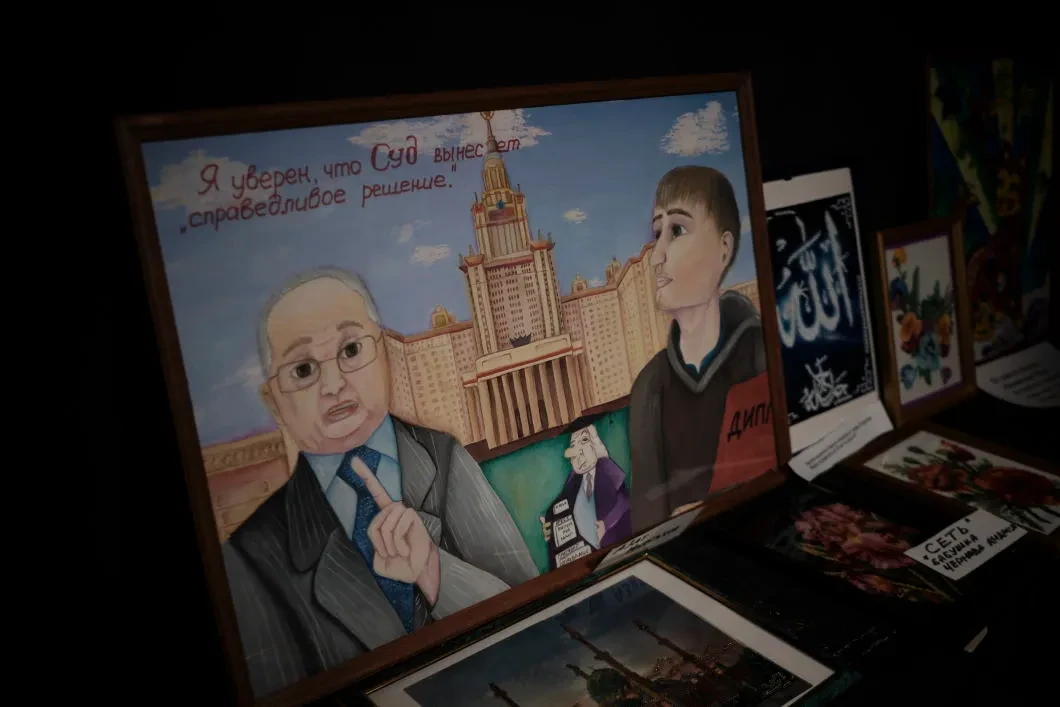 Вот мама Азата Мифтахова, аспиранта мехмата МГУ (сидит в СИЗО по обвинению в нападении на офис «Единой России»). Она держит в руках картину сына и рассказывает, как у него дела в заключении. Мама освободившегося по «московскому делу» 21-летнего студента Бауманки Даниила Конона подписывает поручительство в суд за Мифтахова. Сам Даниил тут рядом — общается с другим освободившимся фигурантом того же дела Сергеем Абаничевым (он пришел на ярмарку со своей девушкой).