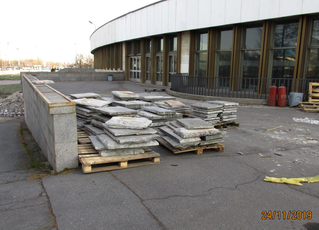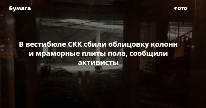В здании СКК у парка Победы сбили облицовку колонн вестибюля и мраморные плиты пола. После этого плиты увезли на грузовике в неизвестном направлении. Об этом сообщили активисты, выступающие против сноса спортивно-концертного комплекса.