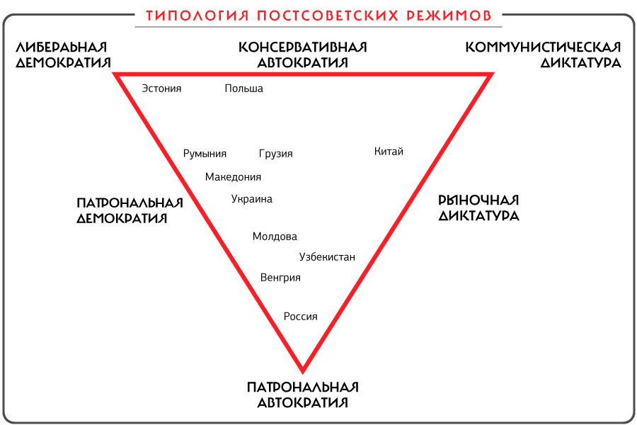 Треугольник позволяет видеть общее и различное постсоветских режимов в разрезе этих проекций и проследить их нелинейные траектории на протяжении трех десятилетий. Так, например, Эстония, Польша и Венгрия осуществили успешный переход от коммунистической диктатуры к либеральной демократии на первом этапе. Однако затем Польша совершила движение в обратном направлении — к консервативной автократии, а Венгрия — в направлении патрональной демократии, а затем и патрональной автократии.