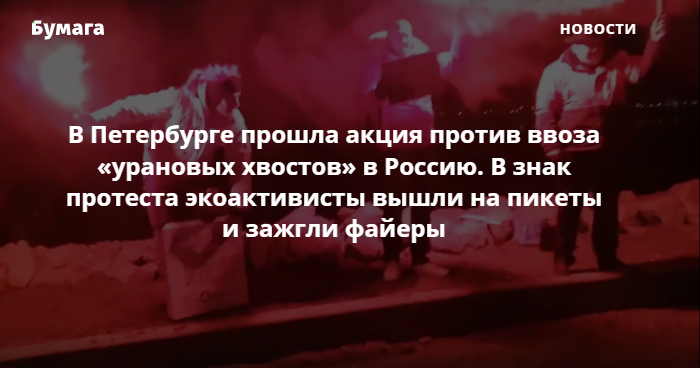 Утром 26 ноября в Петербурге прошла акция против транспортировки токсичных и радиоактивных веществ в Россию. На пересечении улицы Маршала Казакова и Балтийского бульвара экоактивисты вышли на пикеты, а также зажгли файеры и выпустили ракеты, сообщает «Северо-Запад. МБХ Медиа».