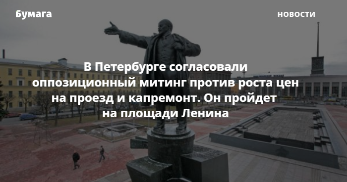 Власти Петербурга согласовали оппозиционный митинг против повышения стоимости проезда в общественном транспорте на десять рублей и роста цен на капитальный ремонт. Об этом «Бумаге» сообщил один из организаторов акции Красимир Врански.
