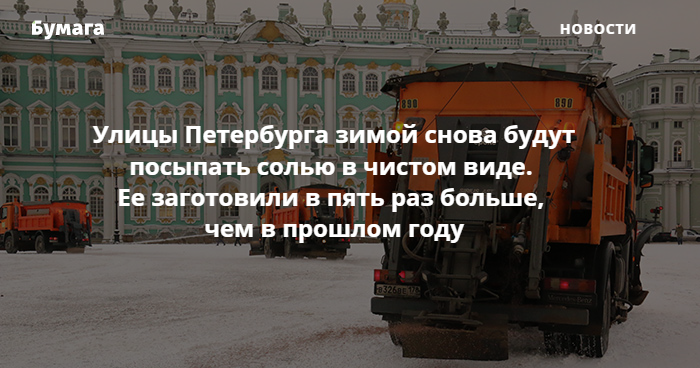 Зимой 2019–2020 года при резких понижениях температуры на улицах Петербурга будут использовать техническую соль в чистом виде, от которой отказывались в прошлые годы. Об этом сообщила «Фонтанка» со ссылкой на и. о. главы комитета по благоустройству Сергея Малинина.