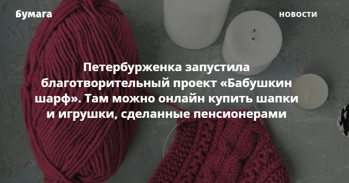 Петербурженка Анастасия Ивченко запустила благотворительный проект «Бабушкин шарф» для помощи пенсионерам и людям с инвалидностью. Это интернет-магазин с доставкой, в котором продаются товары ручной работы, а всю выручку обещают отдавать их авторам. Внимание на проект обратил The Village.