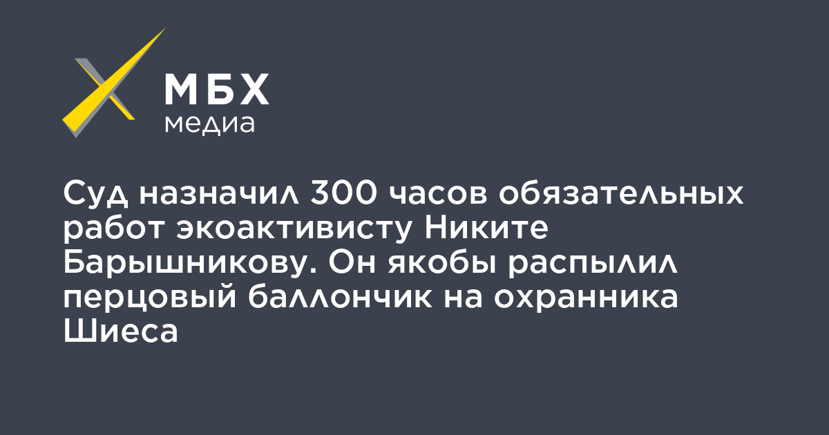 В Архангельской области суд приговорил экоактивиста Никиту Барышникова, обвиняемого в распылении перцового баллончика на Шиесе, к 300 часам обязательных работ, об этом он сообщил «МБХ медиа».
