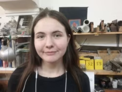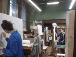 Наш разговор продолжается в тепле – в академии Штиглица. Кафедра монументально-декоративной живописи далеко, на 5 этаже, и пока мы туда идем, Дмитрий Лобанов успевает много чего показать. В полуподвале заходим в мастерскую ковки – оказывается, огромные кованые ворота и затейливые, но неподъемные металлические штуковины куют не румяные бородачи, а миниатюрные студентки – именно их почему-то тянет на такие подвиги.