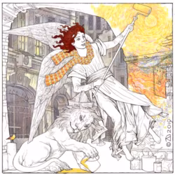 Собственно, это один и тот же рыжий Ангел в струящихся складчатых одеждах и один и тот же огромный Лев в ореоле взволнованной гривы, при первом взгляде напоминающий могучего льва Аслана из “Нарнии”. Но, в отличие от “Нарнии”, это не сказка – чтобы увидеть Льва и Ангела, достаточно выйти на улицу, да хоть на Конюшенную площадь. Многострадальное Конюшенное ведомство, где на крыше растут березки, а сбоку пылится реклама давно минувшего мундиаля, обнесено забором. На приступочке стоят ведерки и баночки с краской, лежат кисточки и тряпки.