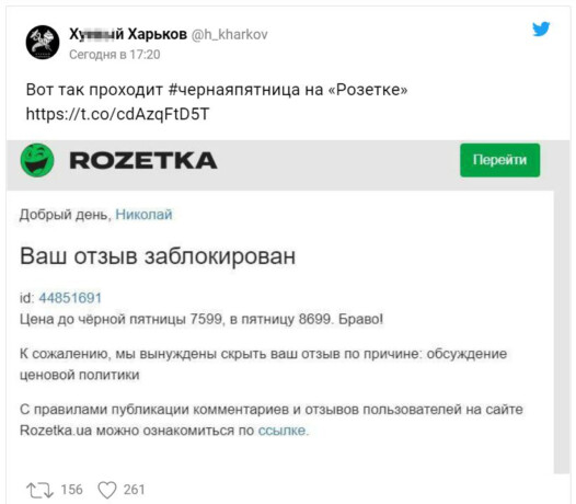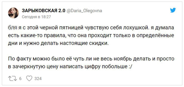 Конечно, это не относится ко всем компаниям и сайтам в рунете. Многие действительно подготовили честные распродажи с достаточно большими скидками. Но в соцсетях всё равно получила популярность фраза «подожду до конца „Чёрной пятницы“, когда всё снова подешевеет».