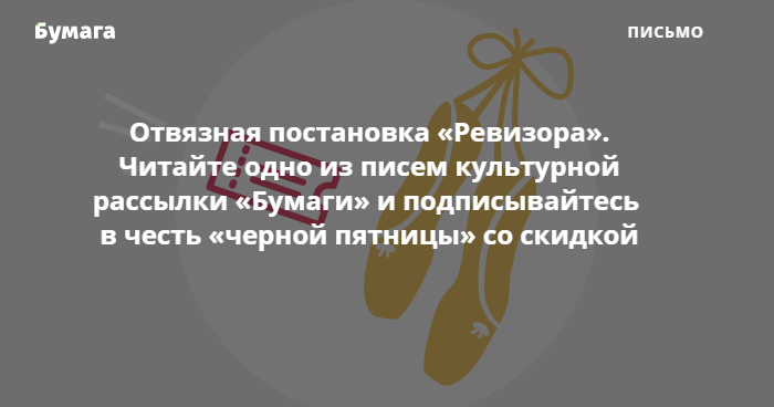 Письма о самых примечательных концертах, спектаклях и выставках приходят по субботам. Каждый месяц автор выбирает тему цикла: в декабре вас ждет рассказ о добрых постановках для всей семьи перед Новым годом. А это письмо из сентябрьской рассылки о постановках по произведениям Николая Гоголя, оно посвящено спектаклю «Ревизор» театра «Суббота», и в нем есть подборка скидок и культурных событий, которые пройдут в ближайшие дни.