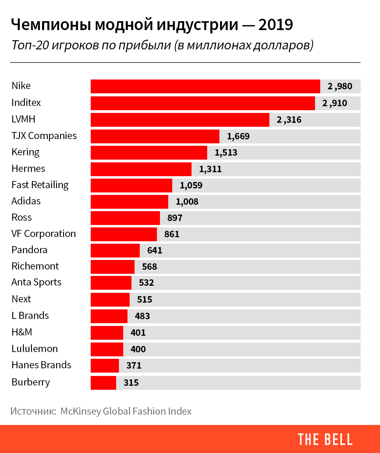 Доля 20 самых успешных компаний в общей прибыли всех игроков модной индустрии превышает 50%. Авторы исследования называют лидеров «суперпобедителями» и объясняют их достижения внедрением инноваций в производство, маркетинг и продажи.