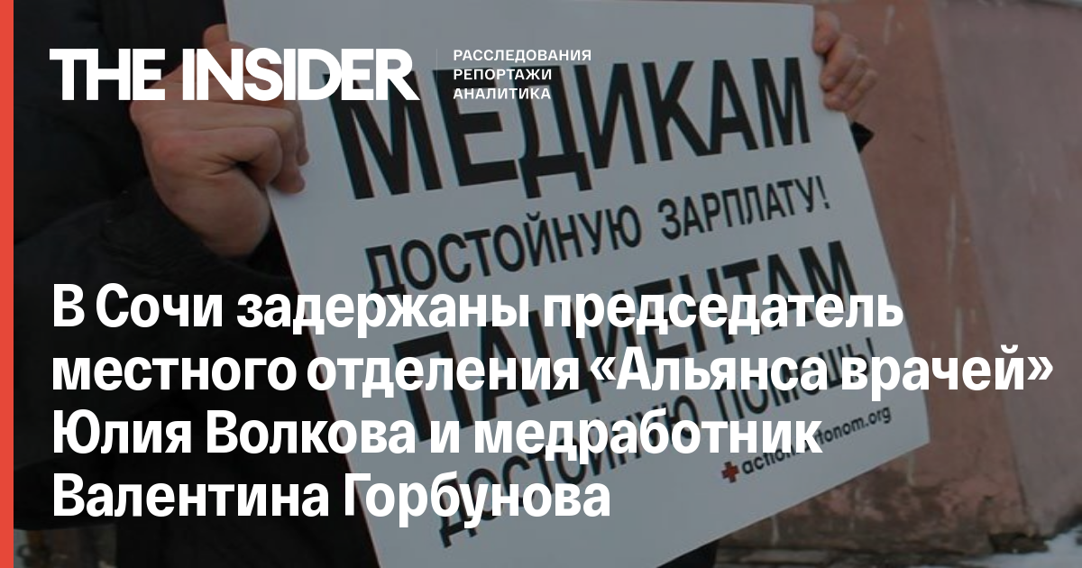 В Сочи во время одиночного пикета задержали председателя регионального отделения «Альянса врачей» Юлию Волкову, об этом говорится в Twitter организации. Помимо Волковой, задержана также медработник Валентина Горбунова. Об этом сообщает «Медиазона».