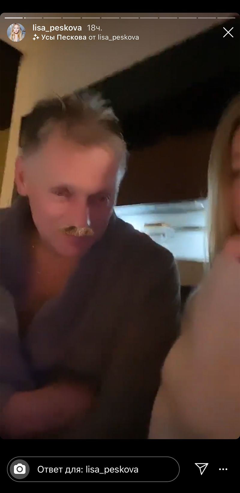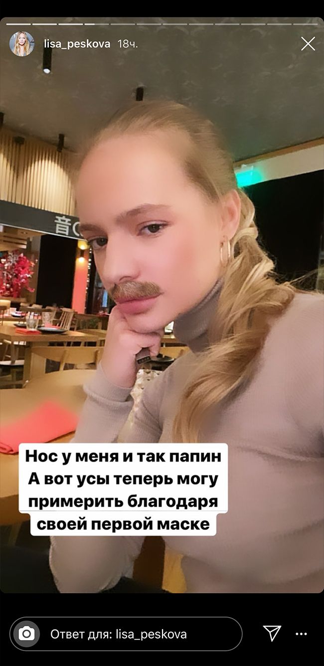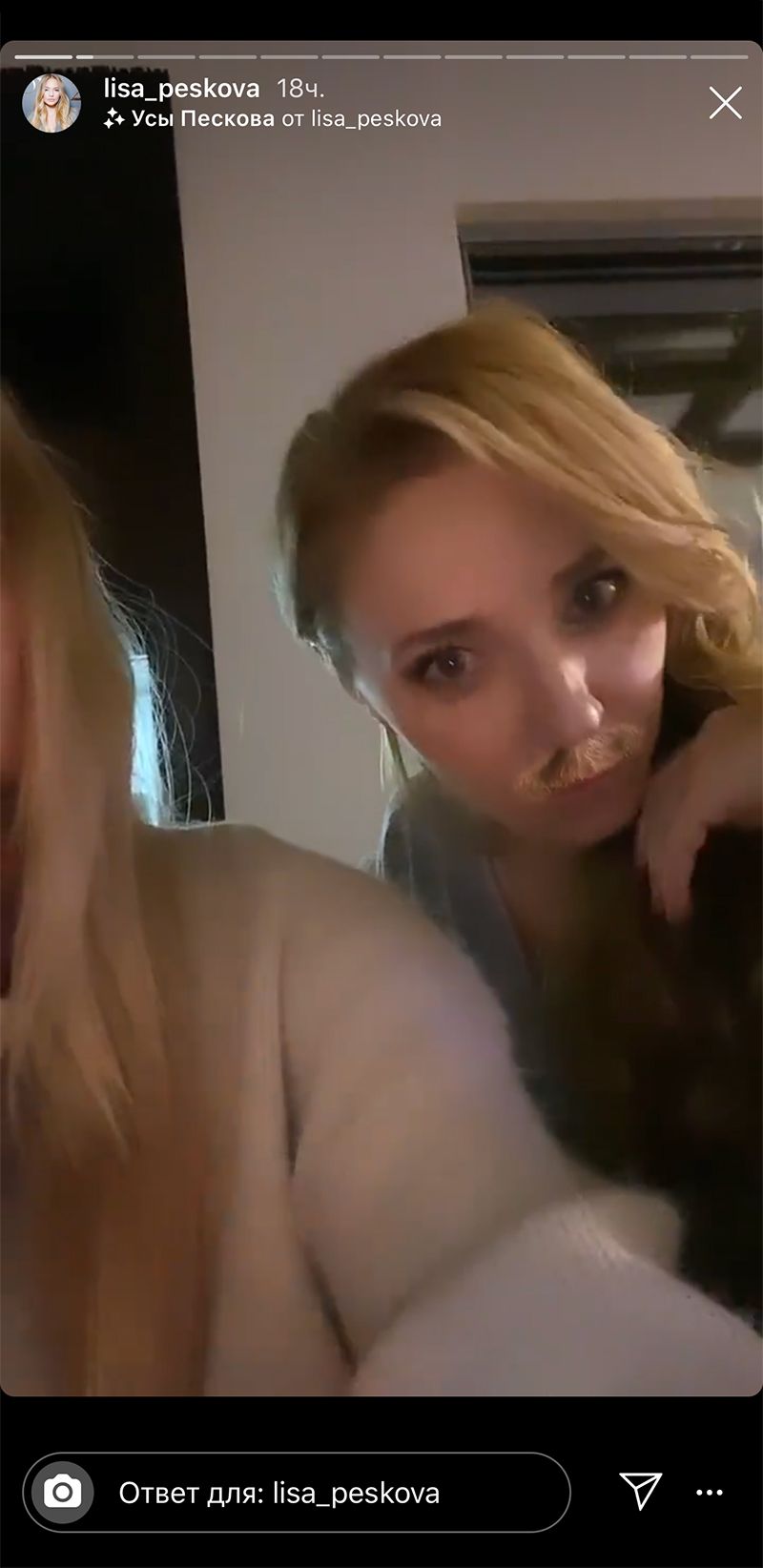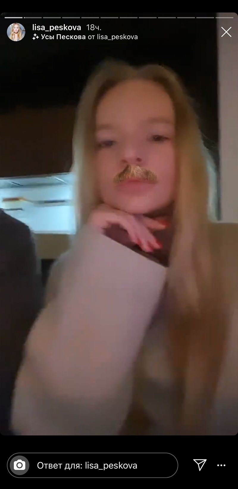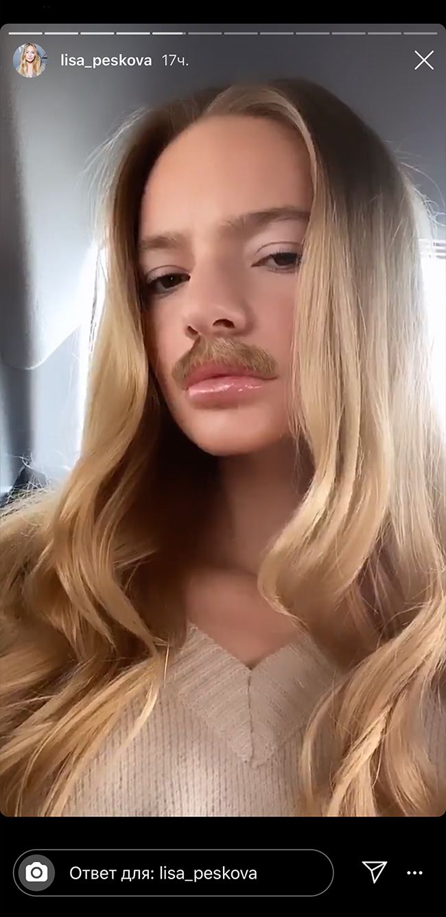 Елизавета Пескова, дочь пресс-секретаря президента России Дмитрия Пескова, выпустила собственную маску для инстаграма. Теперь любой желающий в своих сторис может примерить усы ее отца. Пескова протестировала маску на себе, самом Пескове (да, виртуальные усы наложили поверх настоящих усов!) и его жене Татьяне Навке. «Нос у меня и так папин. А вот усы теперь могу примерить благодаря своей первой маске», — написала Пескова в одной из своих сторис.