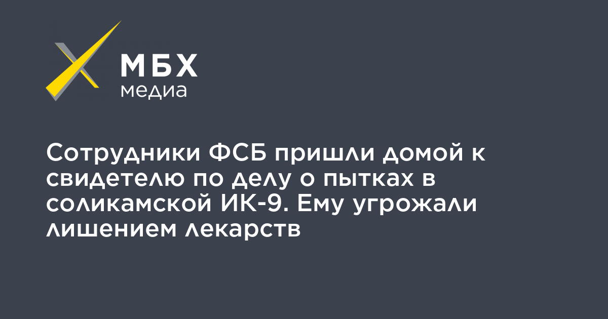 Сотрудники ФСБ пришли домой к одному из свидетелей по делу о пытках в соликамской исправительной колонии №9 (ИК-9) в Пермском крае, об этом «МБХ медиа» сообщил основатель правозащитного проекта Gulagu.net Владимир Осечкин.