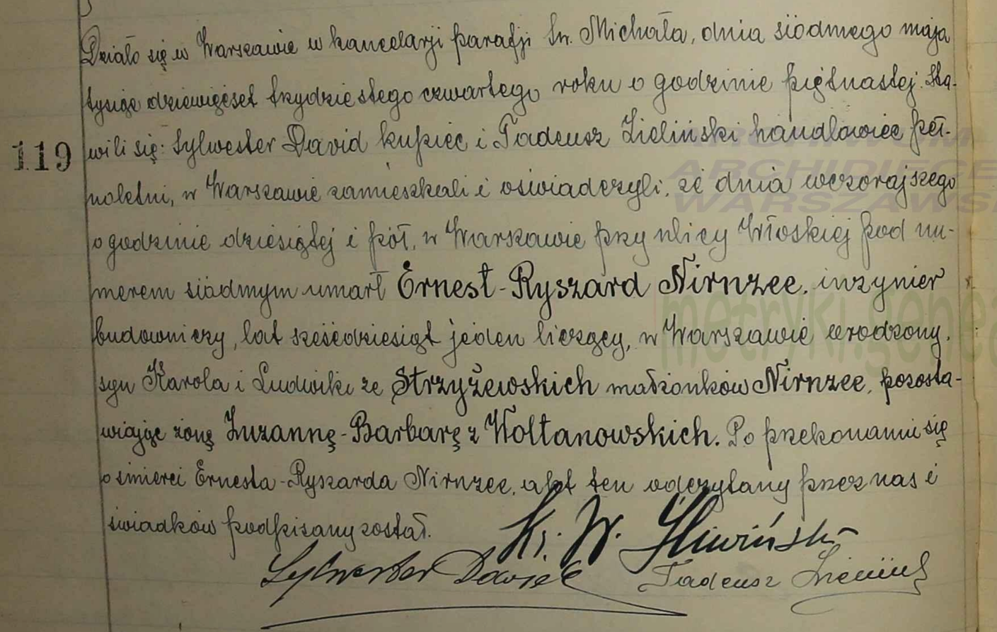 The affair has occasion to take place in Warsaw in the chancellery of the parish of St. Michael. On the date of the seventh of May of the year one thousand nine hundred thirty-four at three o’clock in the afternoon, the following were present: Sylvester David, merchant, and Tadeusz Lislinski, salesman. These adults resident in Warsaw testify that midday yesterday, at half past ten in the morning, on Vloski (Italian) Street in Warsaw, house number seven, there died Ernest-Ryszard Nirnzee, an engineer and construction specialist who had lived a full sixty-one years, born in Warsaw, the son of Karol and Ludwika of the Strzyzewski family and the Nirnzee family. He left a wife, Suzanna Barbara of the Woltanowski family. Following the confirmation of the fact of Ernest-Richard Nirnzee’s death, this act has been read and signed by ourselves and the witnesses.