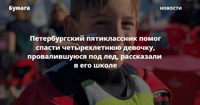 Ученик пятого класса школы № 509 Красносельского района Петербурга Павел Гущин помог спасти четырехлетнюю девочку, провалившуюся под лед. Об этом рассказали в группе школы во «ВКонтакте».