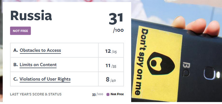 Один из факторов, из-за которого были потери в рейтинге, – изменения законодательства, направленные на ужесточение контроля над Интернетом, и закон о суверенном Рунете. Эксперты Freedom House опасаются, что закон может создать условия для дальнейшей изоляции российского сегмента сети. Составители рейтинга также отметили случаи массового отключения Интернета во время протестных митингов.