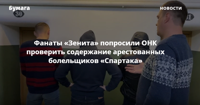 Общественная наблюдательная комиссия Петербурга проверила по просьбе болельщиков «Зенита» условия содержания арестованных на 15 суток фанатов «Спартака». Об этом на своем ютьюб-канале рассказал председатель ОНК Александр Холодов.