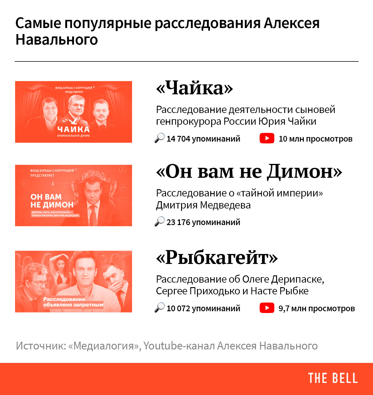 Два других резонансных расследования — о бизнесе сыновей генпрокурора Юрия Чайки (10 млн просмотров) и якобы совместном отдыхе миллиардера Олега Дерипаски и вице-премьера России Сергея Приходько на яхте миллиардера с Настей Рыбкой (9,8 млн). Эти же три расследования больше всего (от 10 тысяч до 23 тысяч раз) цитировались в СМИ, свидетельствуют данные «Медиалогии».