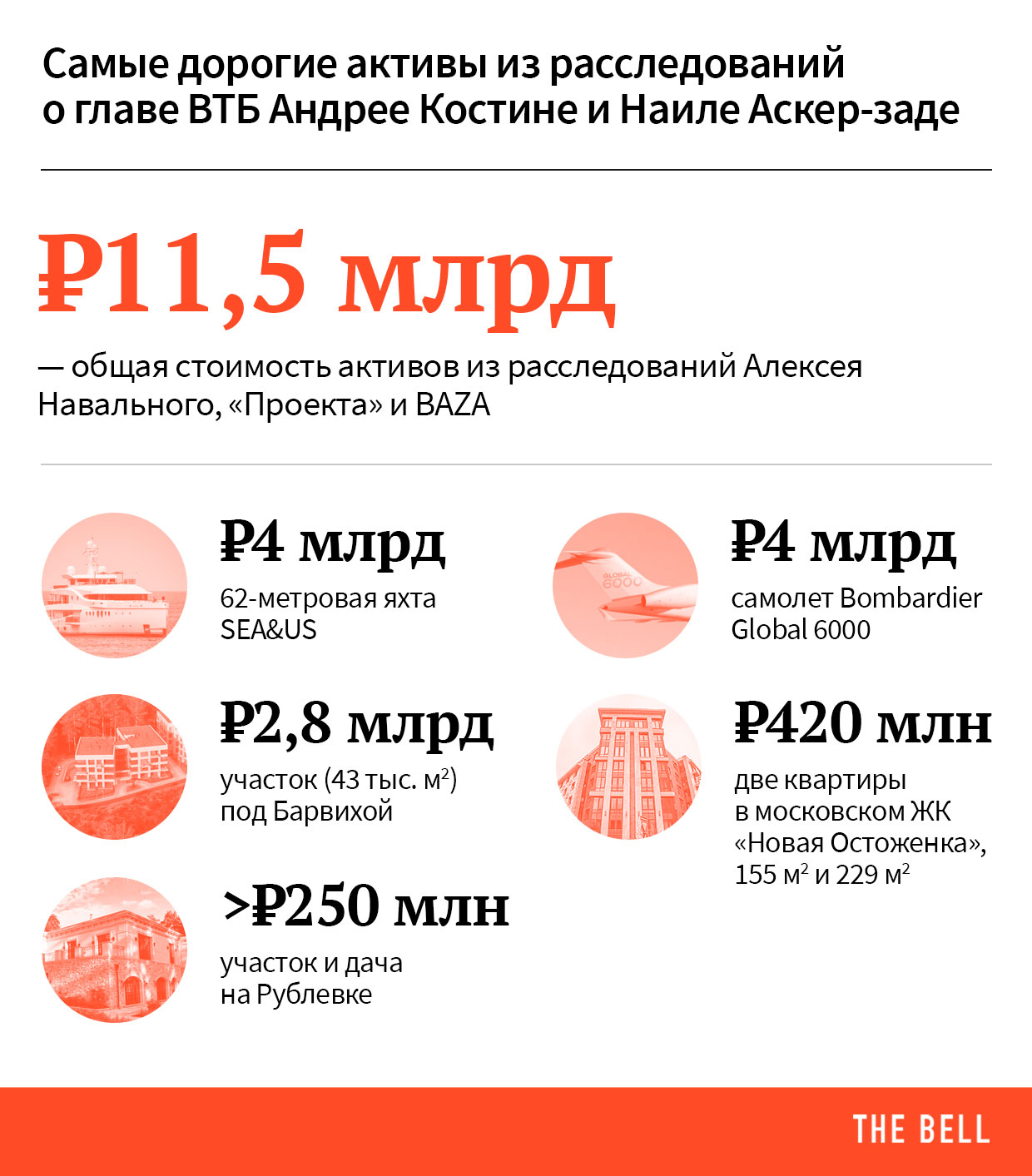 - В августе издание «Проект» опубликовало свое расследование об Аскер-заде. Журналисты обнаружили у телеведущей еще один актив — участок под Барвихой стоимостью почти 3 млрд рублей. Аскер-заде заявила, что участок не ее, а вскоре стало известно, что участок продан. Издание написало также, что Костин и журналистка с детьми были на параде Победы в 2018 году, а за их снимок вместе был якобы уволен один из корпоративных фотографов ВТБ.