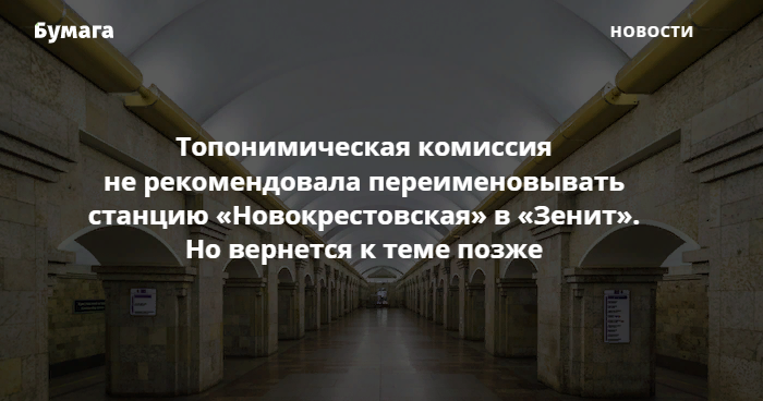 Топонимическая комиссия Петербурга не рекомендовала переименовывать станцию метро «Новокрестовская» в «Зенит». Но намерена вернуться к теме после широкого обсуждения, сообщает «Фонтанка» со ссылкой на председателя городского комитета по культуре Константина Сухенко.