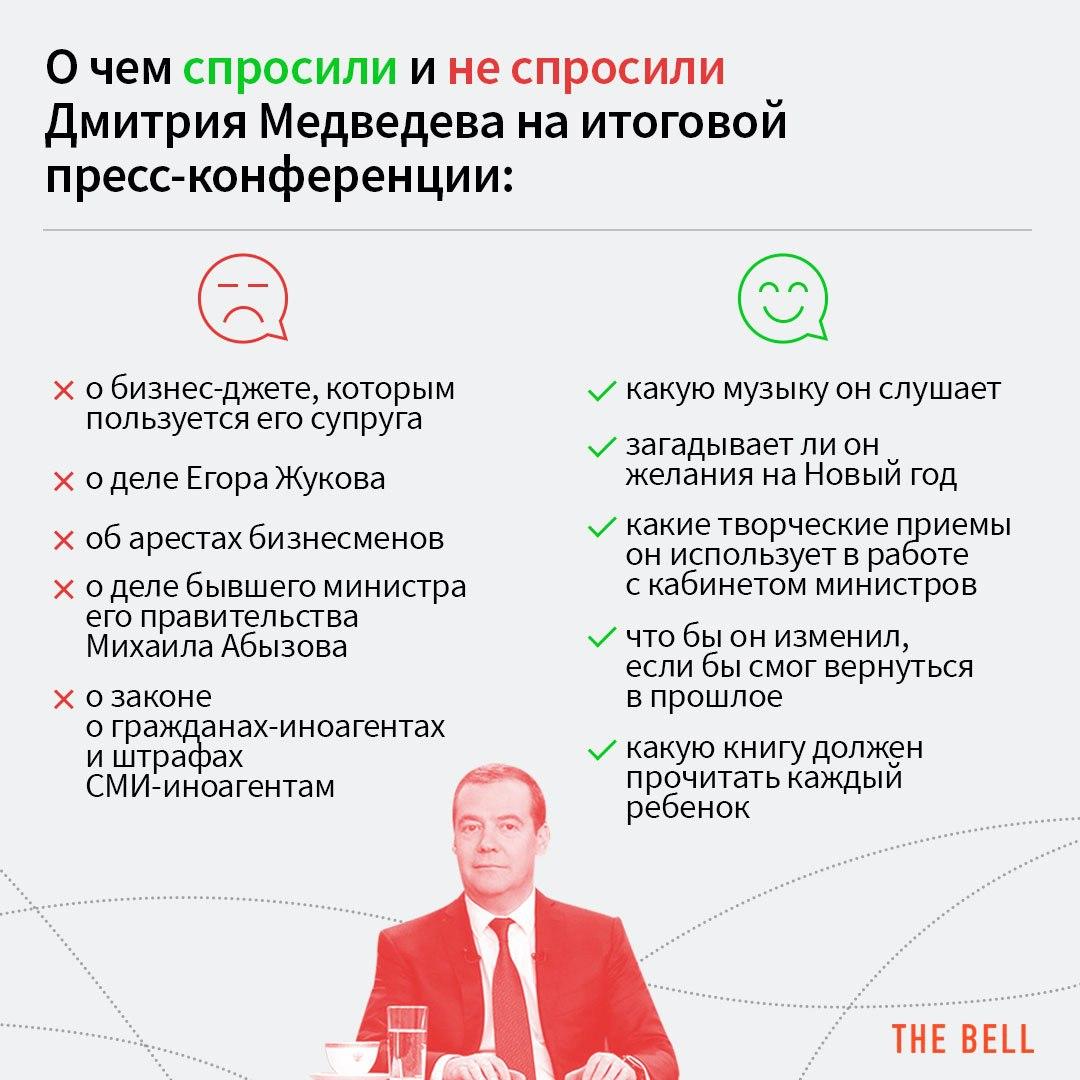 Накануне своей ежегодной пресс-конференции Дмитрий Медведев снова оказался мишенью Алексея Навального: оппозиционер рассказал о перелетах супруги премьера на бизнес-джете, который раньше принадлежал офшору, связанному с ВТБ. Но представители российских телеканалов спрашивать об этом у Медведева сегодня не стали, и общение прошло в дружелюбном, пусть и не особо информативном ключе. Параллельно с Медведевым в Минске в Национальном собрании выступал Александр Лукашенко. Пока Медведев через журналистов советовал ему «не бояться интеграции с России» (пусть и ценой некоторой потери суверенитета), Лукашенко уверял, что политическая интеграция с «братской Россией», в том числе создание единого парламента, даже не обсуждается. В субботу президент Белоруссии встречается в Сочи с Путиным.