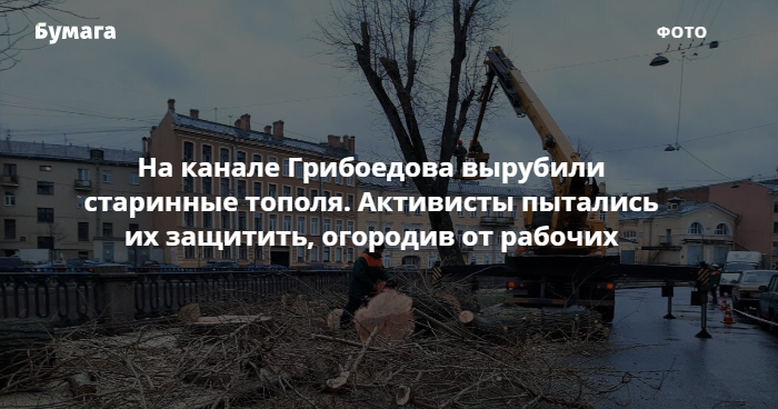 У дома № 119 на набережной канала Грибоедова срубили несколько старинных тополей. Чиновники говорили, что деревья были больны и могли рухнуть. Активисты считают официальную документацию фальсифицированной.