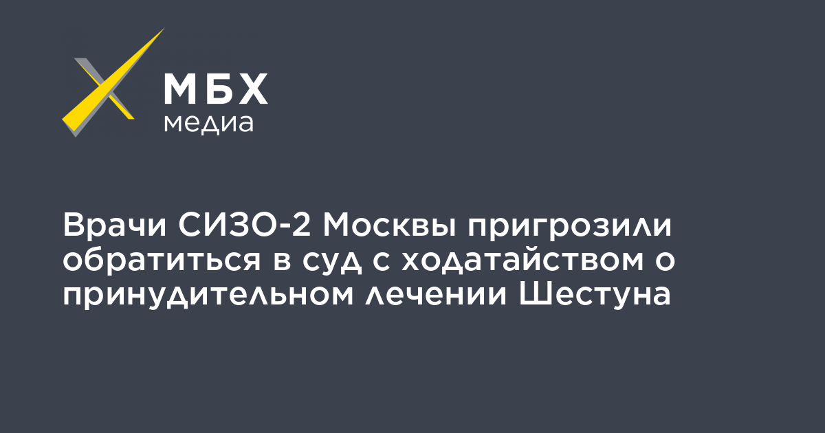 Консилиум врачей психиатрической больницы при СИЗО-2 по Москве пригрозил обратиться в суд с требованием о принудительном лечении и насильственном кормлении бывшего главы Серпуховского района Александра Шестуна. Об этом «МБХ медиа» рассказала его жена Юлия Шестун