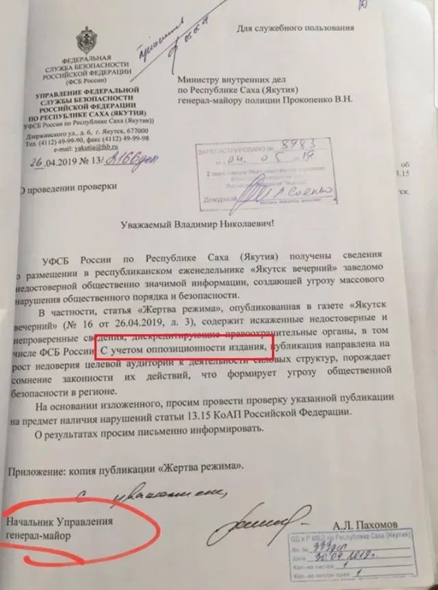 И в редакцию якутской «Вечерки» пришли. Виталий Обедин, замглавного редактора, обнародовал апрельское письмо начальника УФСБ по Якутии Алексея Пахомова главе МВД республики Владимиру Прокопенко о том материале (оно содержалось в материалах судебного дела). Генерал просит генерала провести проверку и «письменно информировать». А перед этим замечает: «С учетом оппозиционности издания, публикация направлена на рост недоверия целевой аудитории к деятельности силовых структур, порождает сомнение законности их действий, что формирует угрозу общественной безопасности в регионе».