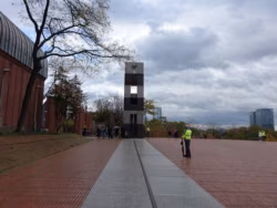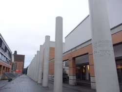 Одна из колонн – живая. Это дуб, символизирующий другие языки и народы. Войти на улицу – в разных переводах она еще называется "Путь прав человека", "Дорога прав человека" – можно через бетонную арку (настоящего) или через средневековую арку (прошлого). Памятник служит напоминанием о преступлениях против прав человека – в прошлом и в наше время, а еще – превращает Нюрнберг из города нацистских съездов в город мира.