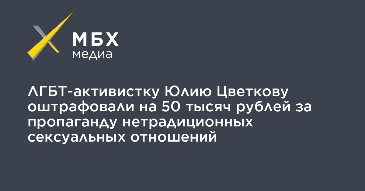 Суд в Комсомольске-на-Амуре оштрафовал ЛГБТ-активистку Юлию Цветкову на 50 тысяч рублей за пропаганду нетрадиционных сексуальных отношений среди несовершеннолетних (статья 6.21 КоАП). Об этом «МБХ медиа» рассказал адвокат Яков Пушкарев.