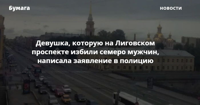 Ранее стало известно, что 9 декабря на Лиговском проспекте семеро мужчин избили 18-летнюю Екатерину Лысых из-за внешнего вида. Девушку доставили в больницу, где диагностировали ей сотрясение мозга без травматических изменений. Нападавшие с места преступления скрылись.