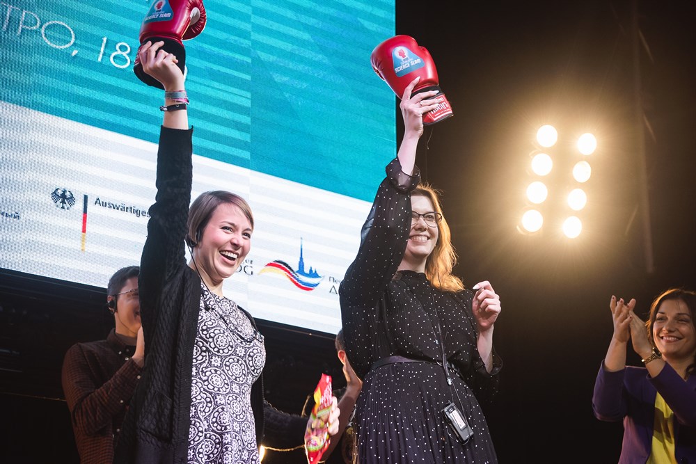 Победу в российско-германской научной битве разделили Франциска Бениш и Юлия Мишенина. По традиции Science Slam они получили боксерские перчатки. Дарить ценные призы в научном поединке не принято. Его цель – «прокачать» молодых ученых и ввести их в мировое сообщество, которое насчитывает сотни людей по всему миру. Сами же слэмеры признаются, что им проект дает гораздо больше.