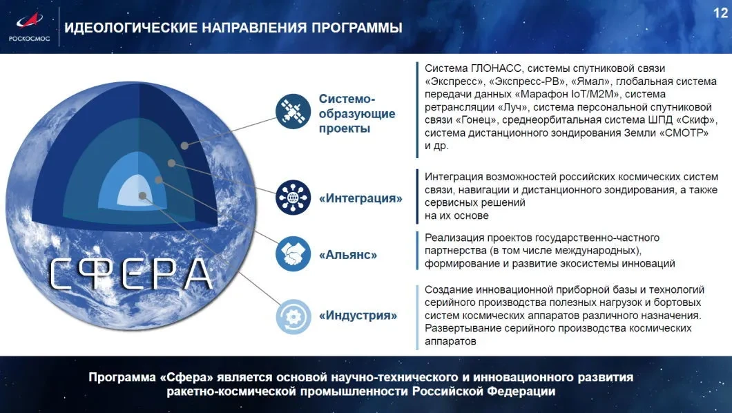 На слайдах указывалось, что стратегическая цель программы — это «создание взаимоувязанной космической информационной инфраструктуры с учетом модернизации действующих и создания новых спутниковых систем связи и вещания, дистанционного зондирования земли (ДЗЗ) и навигации, в интересах всех отраслей экономики России в условиях их цифровой трансформации». Cистема ГЛОНАСС, системы спутниковой связи «Экспресс», «Экспресс-РВ», «Ямал», глобальная система передачи данных «Марафон IoT/M2M», система ретрансляции «Луч», система персональной спутниковой связи «Гонец», среднеорбитальная система ШПД «Скиф», система дистанционного зондирования Земли «СМОТР» и другие были названы «системообразующими проектами» для «Сферы». Речи про «Эфир» в материалах ни в каком виде не было.