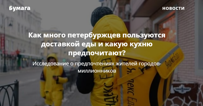 Примерно 67 % жителей Петербурга за последние три месяца хоть раз воспользовались услугами доставки еды. В среднем по российским городам-миллионникам этот показатель составляет 65 %, говорится в исследовании компании OMI (Online Market Intelligence). Маркетологи опросили более 3 тысяч респондентов, чуть меньше 500 из которых были из Петербурга.